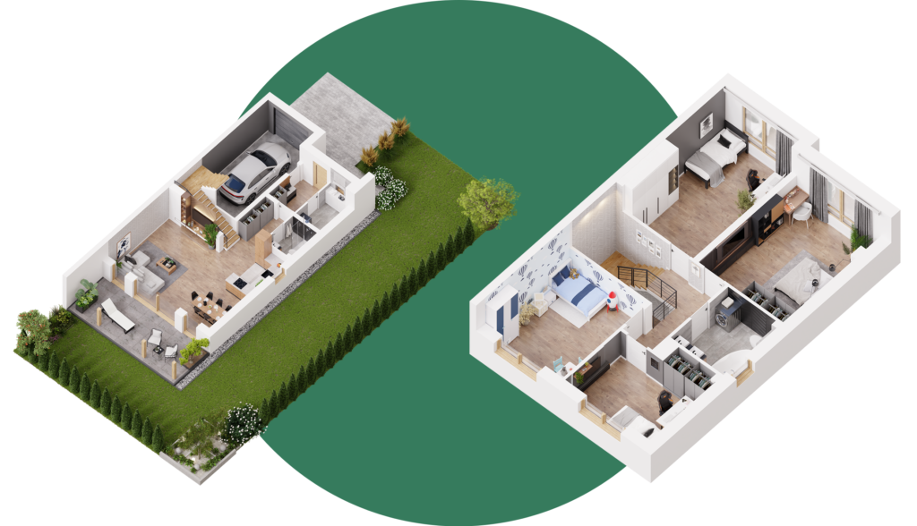 Każdy dom ma swój własny ogród, który staje się naturalnym przedłużeniem strefy dziennej. Zadaszony taras pozwala Ci spędzać czas na świeżym powietrzu niezależnie od pogody. Poranna kawa w deszczowy dzień to tutaj żaden problem. Do tego w bryle budynku czeka garaż, a przed nim dodatkowe miejsce postojowe, dzięki czemu nie martwisz się o parkowanie. To rozwiązania, które realnie poprawiają komfort codziennego życia.